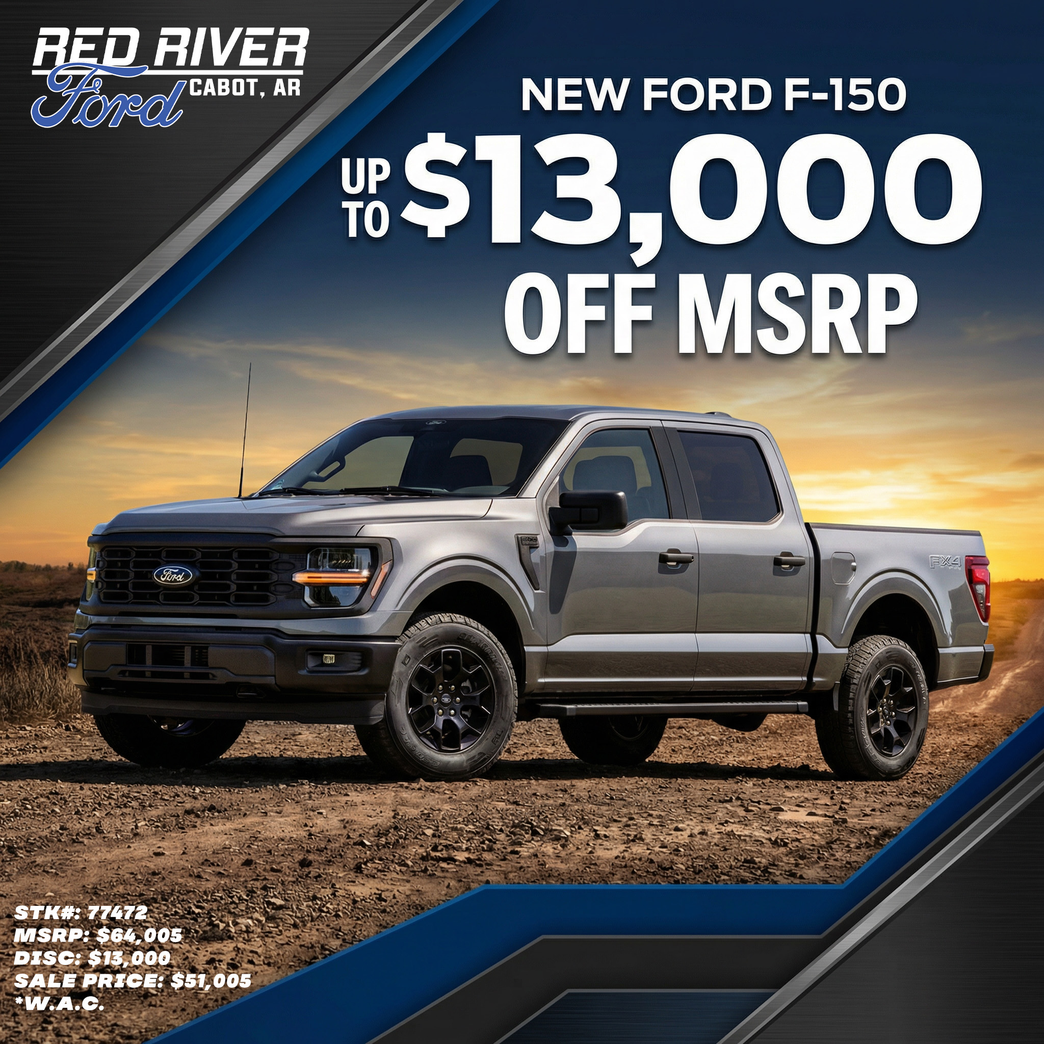 Right now at Red River Ford in Cabot, Arkansas, you can get up to $13,000 off MSRP on a brand-new Ford F-150—America’s favorite truck built for power, performance, and everyday reliability.